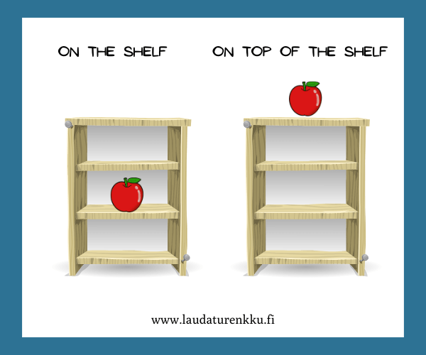 Kuten alussa sanoin, ”on”-prepositio kuvaa usein jonkin pinnan päällä olemista. Toinen tällainen ilmaus on ”on top of”. Se ei ole ihan sama asia kuin pelkkä ”on”, kuten allaoleva kuva esittää. ”On the shelf” voi tarkoittaa missä tahansa hyllyn tasolla, kun taas ”on top of” viittaa nimenomaan hyllyn korkeimpaan kohtaan. Omena on siis ihan ylimmällä hyllyllä.